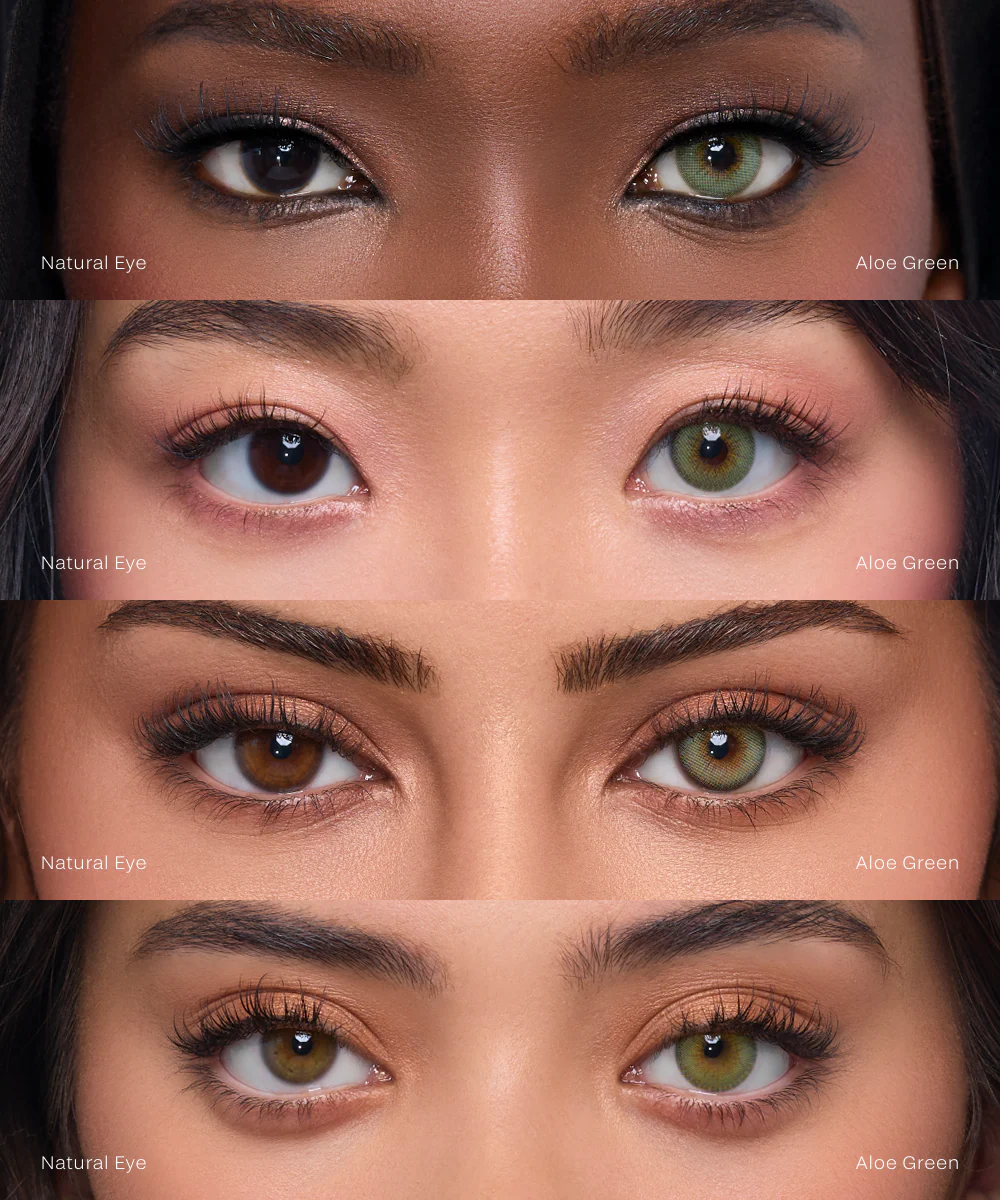 Our Aloe Green three-tone lenses feature a vivid green layer, flecks of amber and a distinct darker limbal ring for that sexy, sultry gaze.