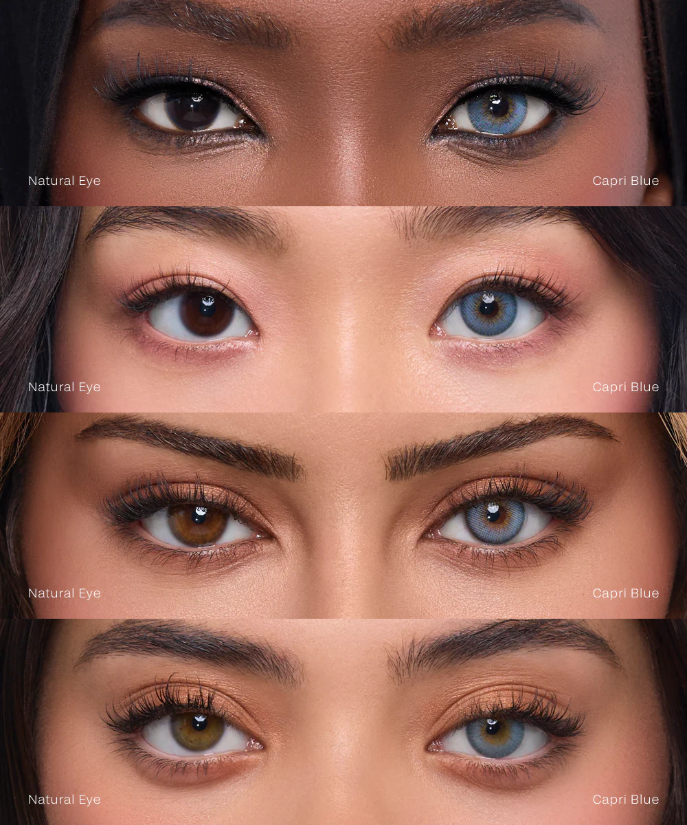 Our Capri Blue three-tone lenses have a beautiful sky-blue base hue with a distinct darker limbal ring. The center of the lens features a golden core that adds a touch of elegance and sophistication to your overall look.